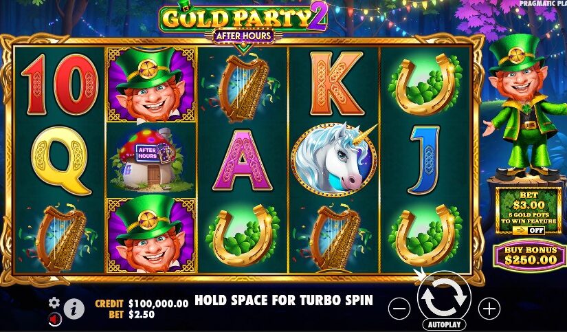 Sepuluh simbol pembayaran Gold Party 2 After Hours adalah peringkat kartu 10-A yang membayar 0,32x hingga 0,8x untuk 5 OAK, serta harpa, rumah jamur, tapal kuda, unicorn, dan leprechaun, yang bernilai 0,8x hingga 4x untuk 5 OAK. Wild muncul pada gulungan 2, 3, dan 4, menggantikan semuanya kecuali simbol Uang. Wild dapat memiliki pengali x2, x3, atau x5 yang berlaku untuk semua kombinasi kemenangan yang diikuti oleh wild. Beberapa pengali dalam kemenangan yang sama akan saling mengalikan.